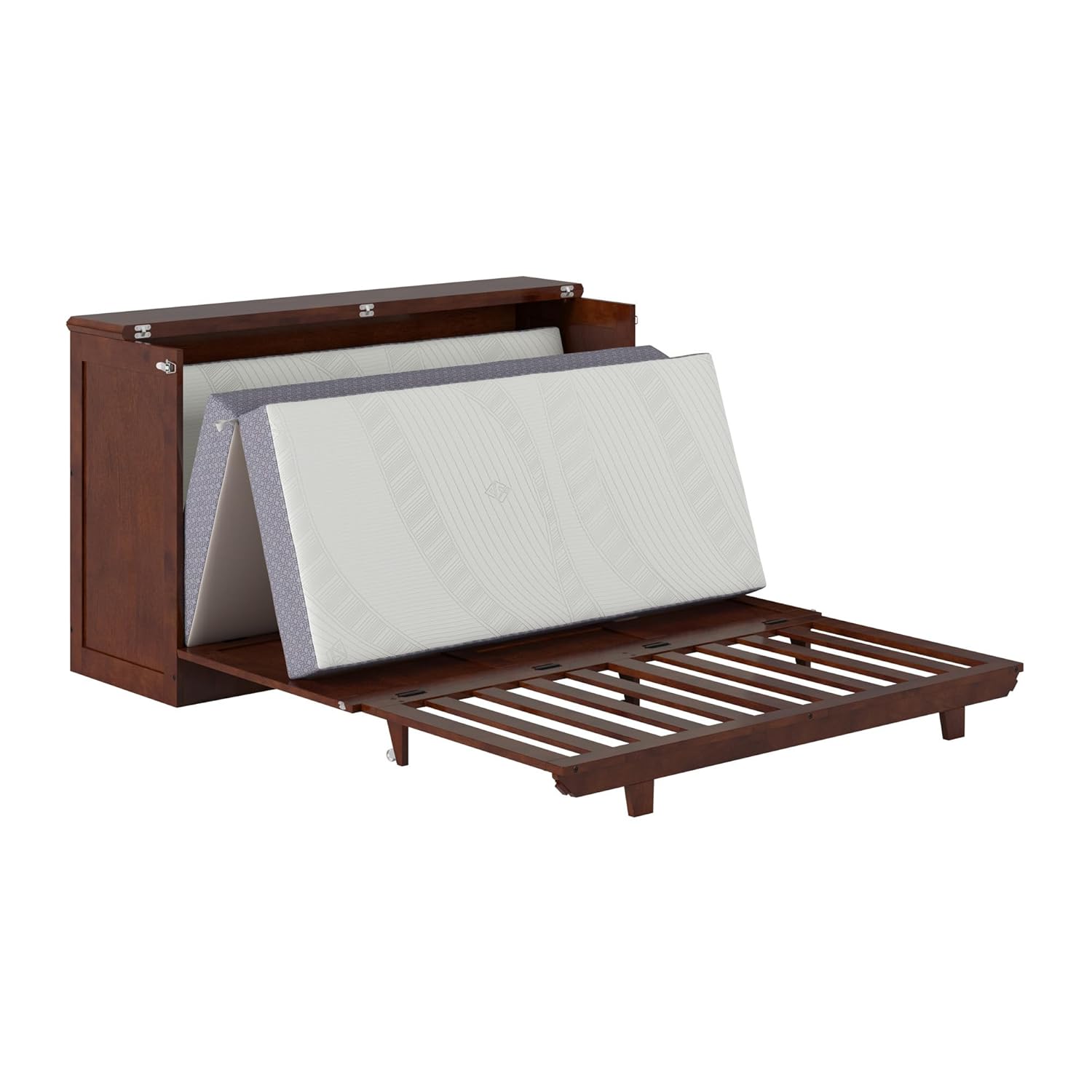 The Charleston Murphy Bed Chest is a stunning blend of vintage charm and modern sophistication, designed to impress. By day, it's a beautifully crafted wood chest with bronze hardware. By night, it effortlessly transforms into a comfortable queen-size bed that is perfect for hosting overnight guests. Crafted for compact living, this piece is ideal for guest rooms, small apartments, or multipurpose spaces. The front panel folds out to sit just above the floor, revealing a durable frame and a 6" premium memory foam mattress with cooling gel that can fold up when not in use. Available in four elegant finishes: White, Black, Walnut, and Light Toffee, the Charleston complements both contemporary and vintage interiors. Whether you're entertaining guests or maximizing your space, the Charleston Murphy Bed Chest is a statement in smart design: functional, beautiful, unforgettable.