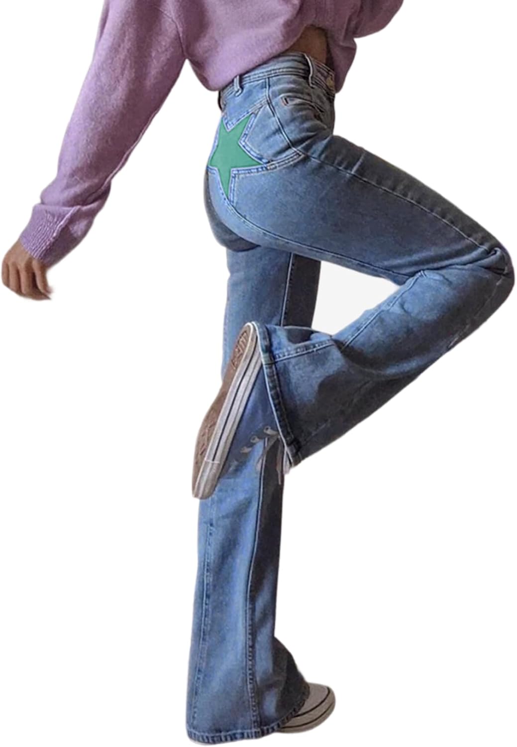 EMMIOL's Women's Flare Jeans blend vintage Y2K style with modern comfort. Featuring a high-waisted fit, a stylish flare leg, and unique star patch details, these denim pants are a statement piece for your wardrobe. Crafted from quality materials for a perfect vintage look.