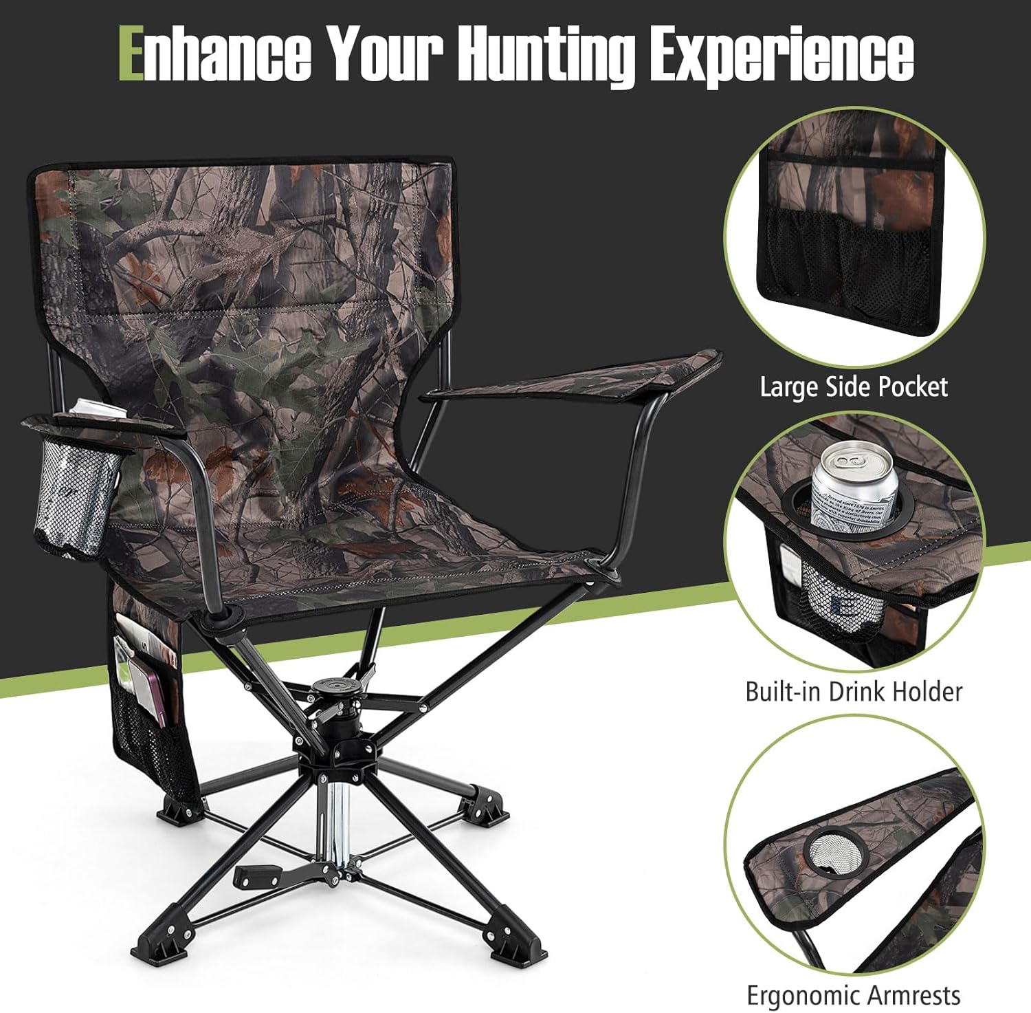Description: Looking for a silent hunting chair to enhance your experience in the wild? Our hunting chair features a noiseless 360° swivel base, perfect for observing your prey without alerting them. Crafted with durable 600D Oxford fabric, this chair provides comfort during long waits in the woods or by the lake. The included storage bag and drink holder make essentials easily accessible, while the carrying bag allows for convenient transportation to your hunting spot. With a weight capacity of 300 lbs, non-slip foot pads for stability, and a camouflage design, this chair is ideal for hunters who value stealth and comfort in the great outdoors. Features: Noiseless 360° spinning seat Durable 600D oxford fabric Wide, ergonomic seat Side pocket and drink holder 300 lb weight capacity Non-slip foot pads Folding and lightweight design Camouflage pattern No assembly required Specifications: Color: Camouflage Material: 600D Oxford Fabric, PE, Metal Product Dimensions (Unfolded): 32" x 21" x 35" Product Dimensions (Folded): 10" x 10" x 43.5" Portable Bag Size: 11" x 8.5" x 44" Backrest Width: 23" Backrest Height: 17.5" Armrest Height: 27" Seat Height: 17.5" Seat Depth: 19" Seat Width: 20" Cup Holder Diameter: 3.5" Weight Capacity: 300 lbs Net Weight: 9 lbs Package Includes: 1 x Swivel Hunting Chair 1 x Carrying Bag 1 x User Guide