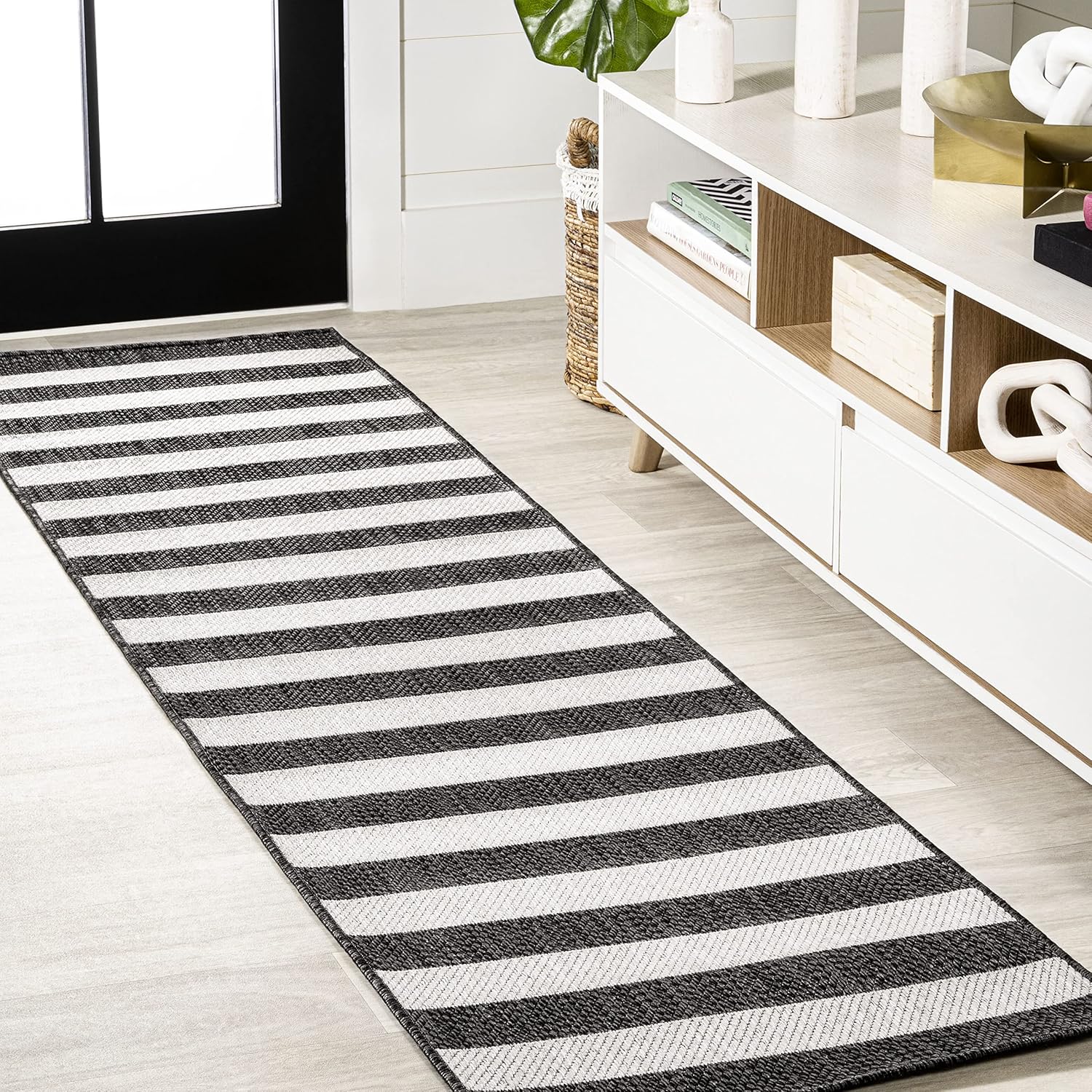 Bring home a timeless stripe rug for your modern cottage, beach bungalow or farmhouse. Our durable low pile rug features wide, woven stripes in two contrasting colors. Add graphic punch to your living room, dining room, bedroom, or porch with this easy-care, family-friendly rug.