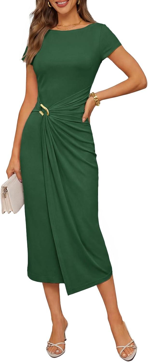 Season & Style:Embrace a refined silhouette that balances structural elegance with fluid movement, making this midi dress a timeless addition to a year-round wardrobe. The design features a classic boat neckline that gently frames the collarbone, offering a modest yet sophisticated upper profile suitable for professional and social settings alike. Crafted from a smooth, high-quality fabric with a subtle stretch, the garment contours comfortably to the body, providing a tailored fit that moves with you rather than restricting motion. The defining feature is the artful side ruching at the waist, gathered securely by a polished metallic ring; this detail creates soft, asymmetrical drapes across the midsection, adding visual texture and a flattering, architectural element to the smooth sheath shape. Versatile Occasions:The adaptability of this sheath dress allows it to transition seamlessly between distinct environments, serving as a reliable choice for a busy schedule. It projects a professional command suitable for important business presentations or corporate networking events, where the modest cut and knee-length hemline adhere to office codes. Effortless Styling:The solid colorway and distinctive waist detail provide a sophisticated foundation that invites various styling interpretations depending on the desired aesthetic. For a commanding office ensemble, pair this piece with a sharp, tailored blazer in a neutral tone like black or camel, finishing the look with closed-toe pumps and a structured tote bag. To transition into the evening, remove the outer layer to showcase the waist detail, switching to metallic strappy sandals and a sleek clutch. The gold-tone hardware at the waist pairs naturally with gold hoop earrings or a delicate bracelet, eliminating the need for a belt or heavy necklaces.