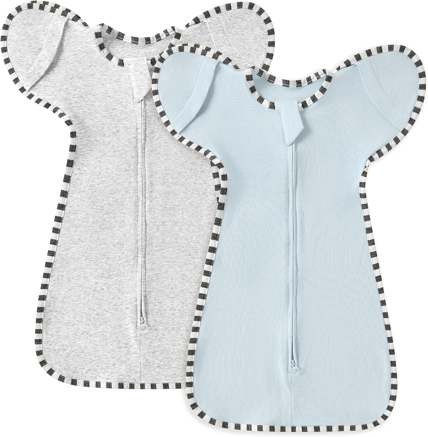 Multipurpose Arm Up Swaddle Design - The special cuffs with button mitten, allows your baby to sleep with arms in/out/free position. The swaddle is prefect transitioning, it provides babies with a enough arm stretch room, it can help to maintain an established sleep routine, allow your baby to sleep through the night, and move to arms-free sleeping.