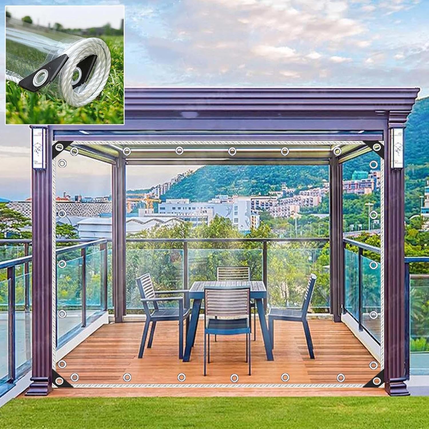 ♣Product Description:●Outdoor tarp curtains are made of high-quality PVC material, healthy and environmentally friendly, with the functions of wind and rain protection, heat insulation and heat preservation, dust-proof, UV protection, etc. Reliable toughness and durability make the tarpaulin bring you years of protection.●Transparent tarpaulin has a good light transmittance experience, does not affect lighting and plant photosynthesis, does not block the line of sight, you can feel the beauty of nature even indoors.●Strong practicality: wide range of application, can perfectly blend with your different covering places.●High security: four corners triangular rubber sleeve reinforcement + rust-proof metal eyelets all around + edges are precision stitched with nylon rope, tear-resistant, pull-resistant, more uniform force, easy to fix and dismantle.♣Product parameters:Name: outdoor transparent tarpaulinMaterial: PVC soft glassThickness: 0.35mmWaterproof index: 100%Transparency:99.99%Grommet spacing: 30cmPackage: 1×waterproof tarpaulin♣Notes:ღWipe with soapy water or warm water, not machine washable.ღDo not use a knife to open the package to avoid the waterproof tarpaulin being scratched.♣After-sales service:Any questions or dissatisfaction after receiving the goods, please feel free to contact us by e-mail, we will provide you with 100% after-sales service, please feel free to buy.