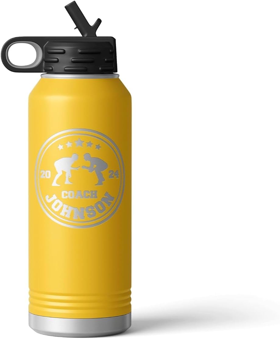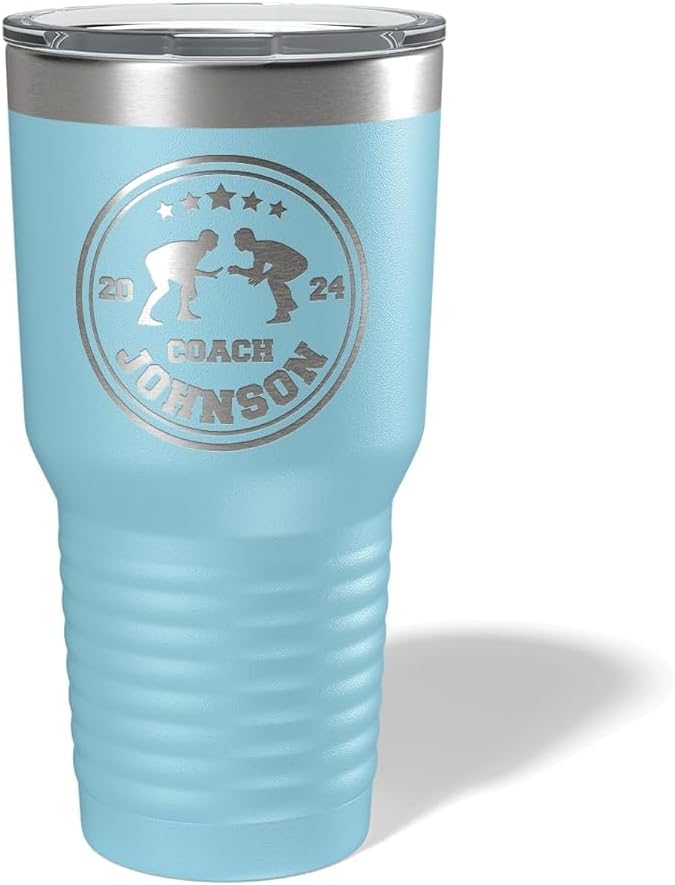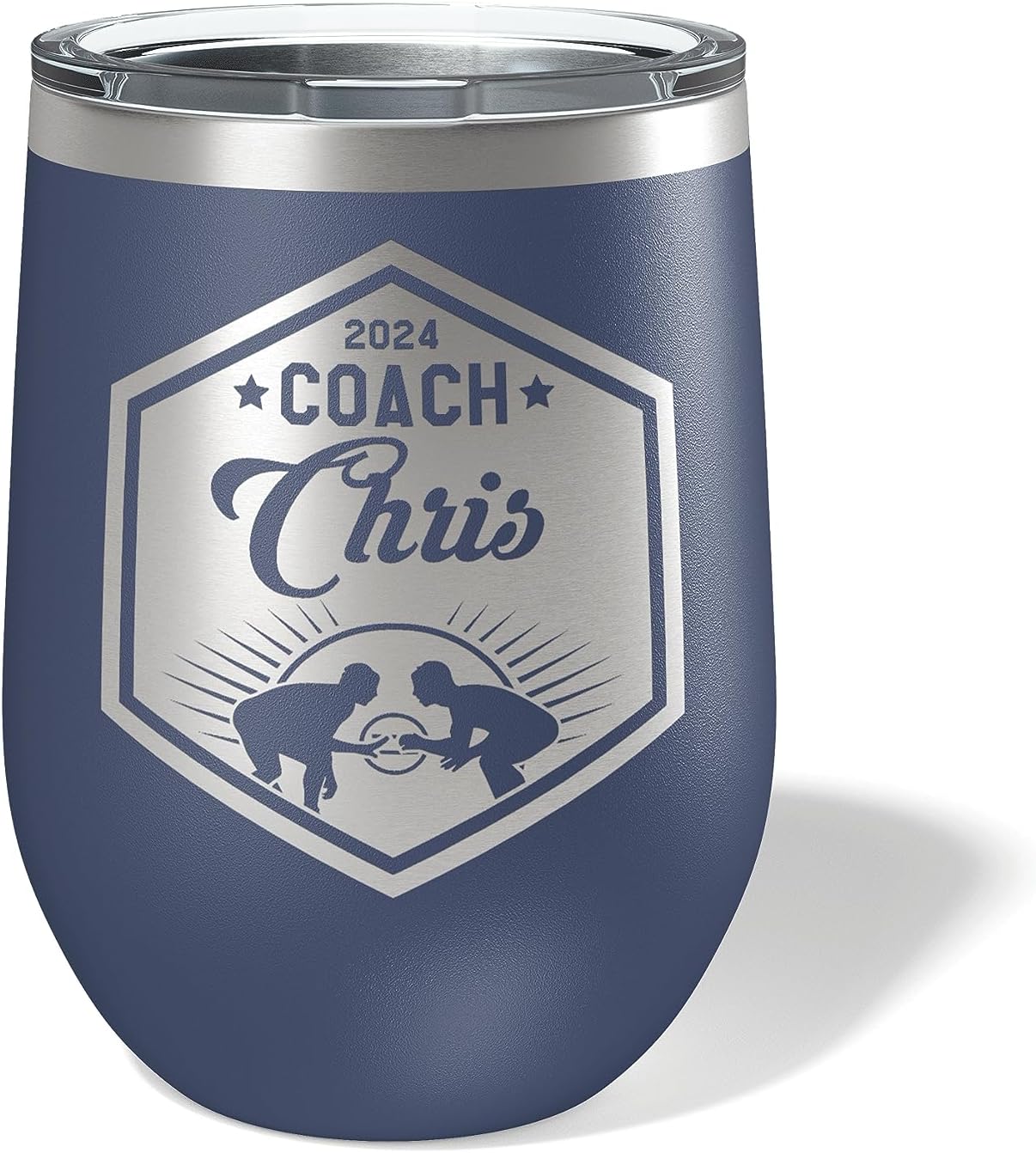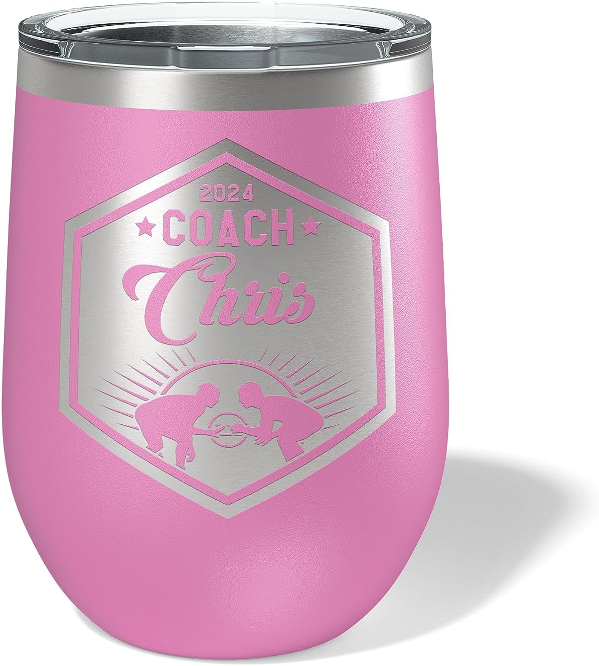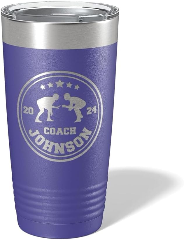 Introducing the ultimate Coach Tumbler, the perfect reusable and eco-friendly gift for your Wrestling coach, Assistant Coach or manager. Our tumblers are available in four sizes - 12oz wine tumbler, 20oz tumbler, 30oz tumbler, and 32oz water bottle - catering to all your hydration needs. Crafted from 18/8 gauge stainless steel, our Polar Camel Tumblers are double-walled vacuum insulated, 2X heat & cold resistant, and ideal for keeping your beverages at the perfect temperature throughout the day. With 15 color options to choose from, you can select your favorite color or choose a color that represents your team. Our Custom Wrestling Coach design is personalized with your Coach’s Name, making it a great way to show appreciation to your Wrestling coach. Each tumbler is laser engraved with precision and produced quickly within 1-3 day production time, so you can have your product in hand in no time! Our Coach Tumbler is perfect for outdoor activities, work, travel, and daily use. With a clear acrylic lid that fits snugly, you don't have to worry about spills or leaks, and you can easily see how much drink you have left. Plus, our tumblers are easy to clean and maintain, ensuring long-lasting use. When you purchase our Wrestling Coach Tumbler, you're not just buying any ordinary tumbler - you're investing in a high-quality, durable product that will serve you for years to come. Our tumblers are not just functional but also stylish, making them a great conversation starter. They are also perfect for gifting, especially for the Wrestling coach in your life. Whether it's a birthday, holiday, or just because, our Coach Tumbler is the perfect gift that will make your Wrestling Coach feel appreciated and loved. Don't settle for any ordinary tumbler - choose our Coach Tumbler for the ultimate experience. Order now and add this perfect Wrestling Coach Gift to your cart, and enjoy your drinks in style while contributing to a sustainable future.